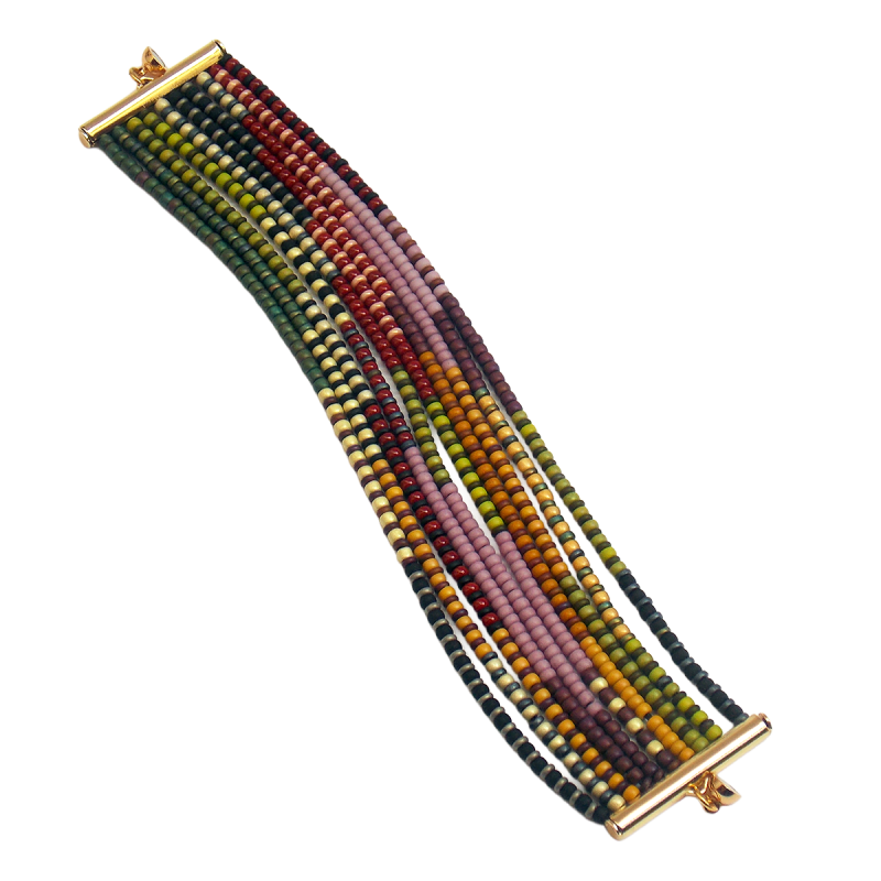 This bracelet —a unique piece inspired by the Telúricos y Primitivos exhibition at the Carmen Thyssen Museum Málaga— blends elegance, exclusivity and artistic resonance. Hand-crafted with fine crystal beads, its design reflects the telluric richness and primal symbolism of the exhibition: a connection to earth, ancestry and the essential gesture of creation. The magnetic steel clasp with gold plating provides a refined, secure and comfortable finish. With a width of 3 cm, the bracelet is available in sizes L / M / S; please indicate your preferred size in the order notes for a precise fit.