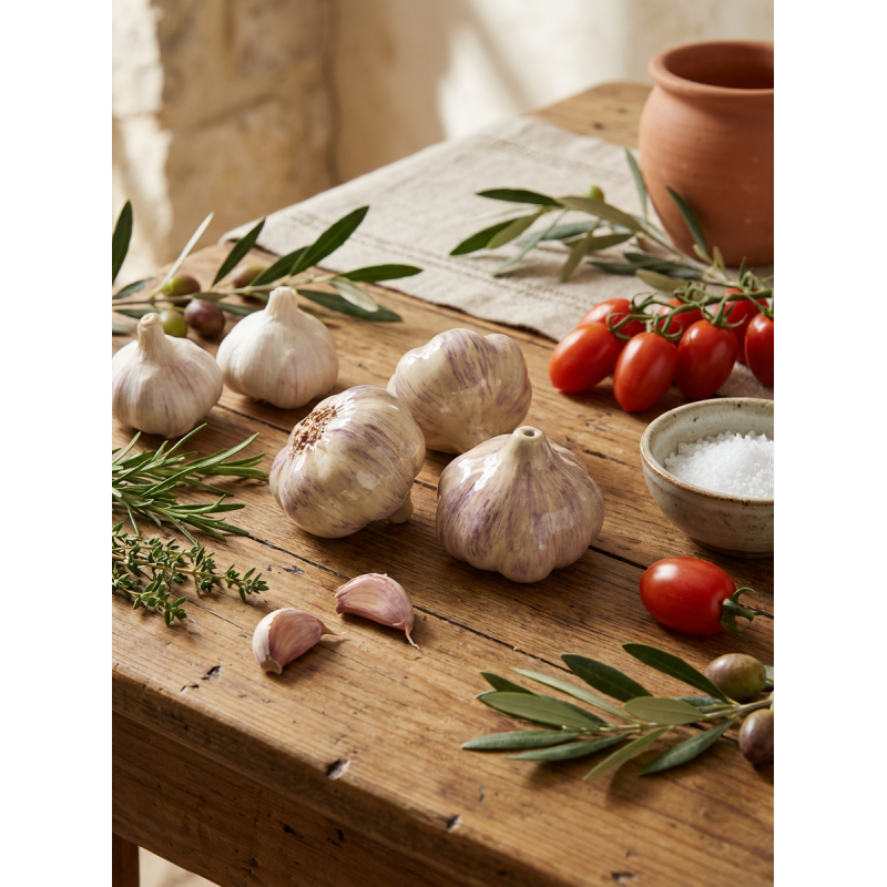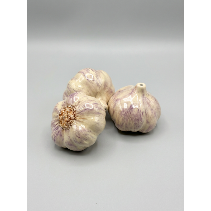 Ajo decorativo de cerámica artesanal, moldeado y pintado a mano, con maduración del esmaltado mediante cocción a 980 grados. El proceso de producción artesanal otorga a cada pieza un carácter único y exclusivo, evidenciando la maestría del estudio María Rengel Castro, colaborador del Museo Carmen Thyssen Málaga.