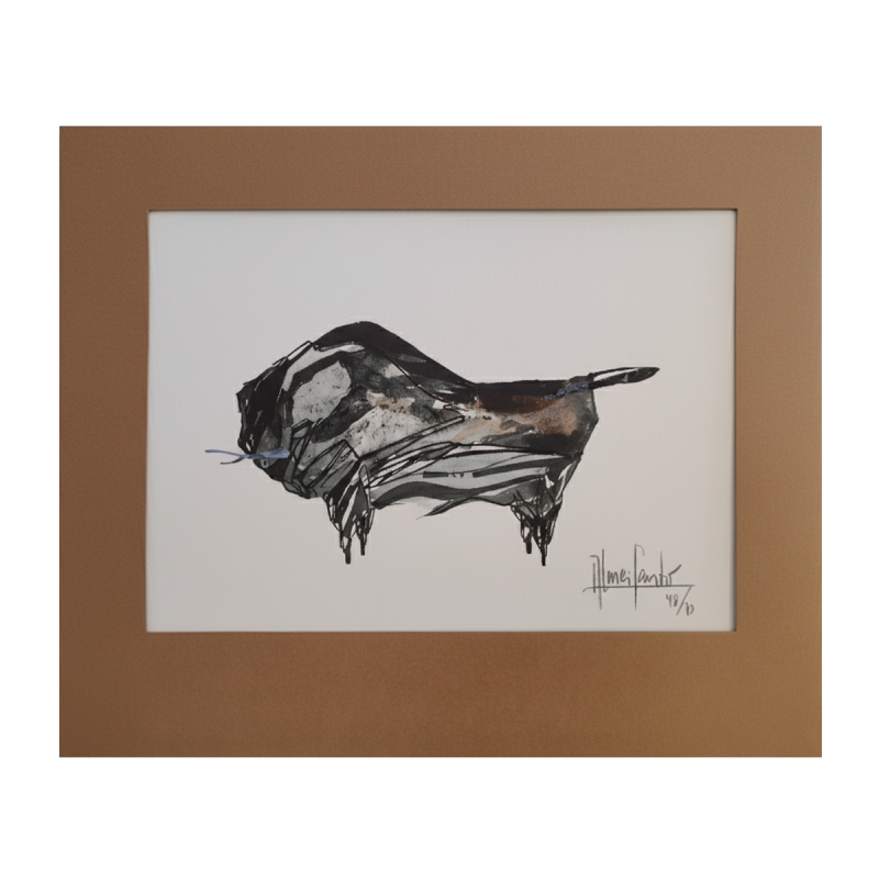 Descubra la fuerza y el dinamismo del toro de lidia a través de la visión única de Ignacio Almeida Santolaria. Este grabado de edición limitada, titulado "Toro Esquemático", captura la esencia del animal en un estilo abstracto y expresionista. Las pinceladas gestuales en tinta negra y tonos sepias definen la silueta robusta del toro, transmitiendo su energía y bravura con una economía de medios que evoca la tradición taurina y el arte contemporáneo andaluz.