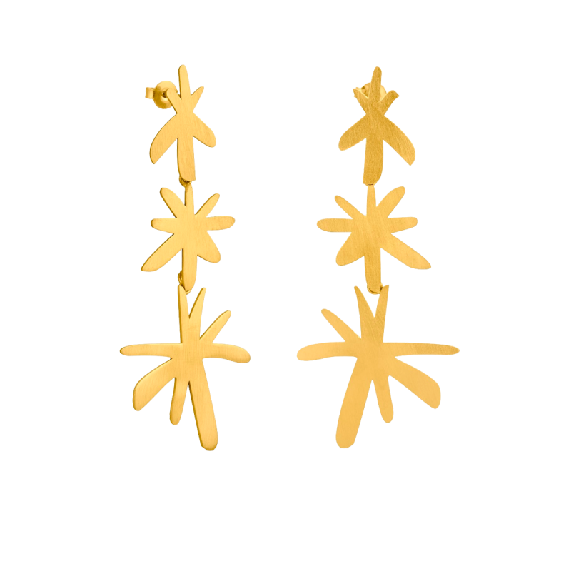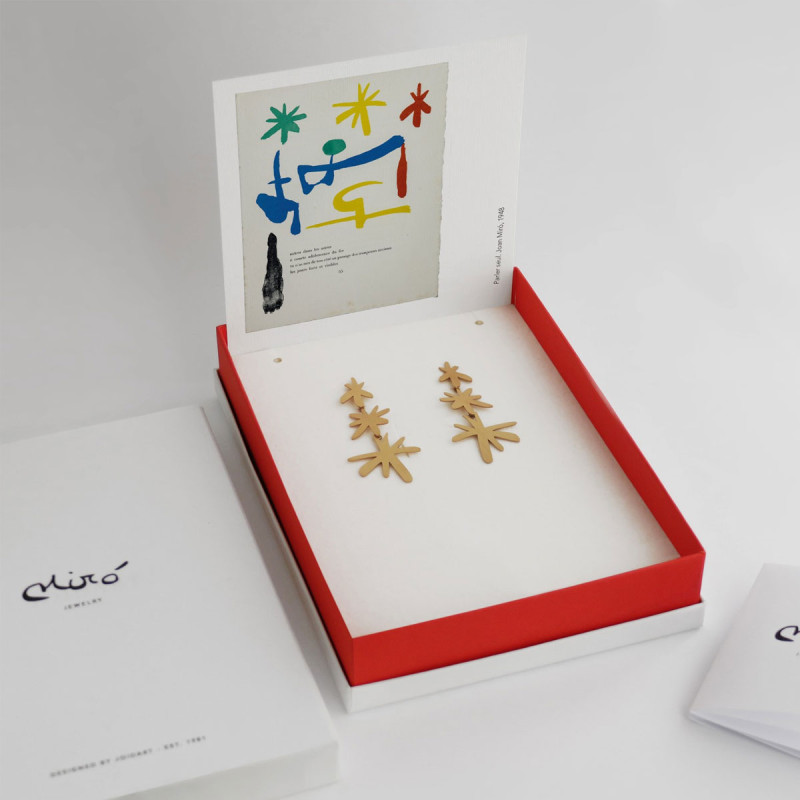 Los Pendientes Flor largo Miró forman parte de la colección Miró Jewelry de Joidart, inspirada en la obra del célebre artista Joan Miró. Elaborados en metal con baño de oro de 24K, estas piezas únicas reinterpretan las formas orgánicas y el espíritu surrealista del pintor, ofreciendo un diseño contemporáneo y elegante. Cada pendiente, con acabado mate y siluetas estrelladas, evoca la energía creativa del arte moderno y es ideal para quienes buscan accesorios sofisticados con un toque artístico. Perfectos para lucir en eventos culturales, exposiciones o como complemento exclusivo en tu día a día.