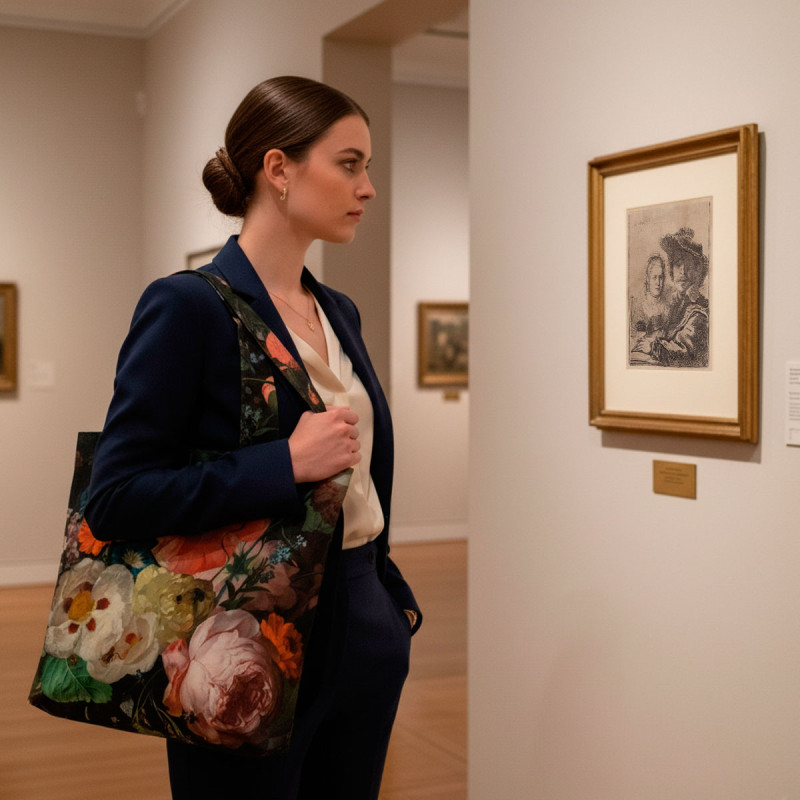 Bolsa plegable, con bolsillo complementario para guardarla, que reproduce en su diseño un detalle de la obra Still Life de Rachel Ruysch.