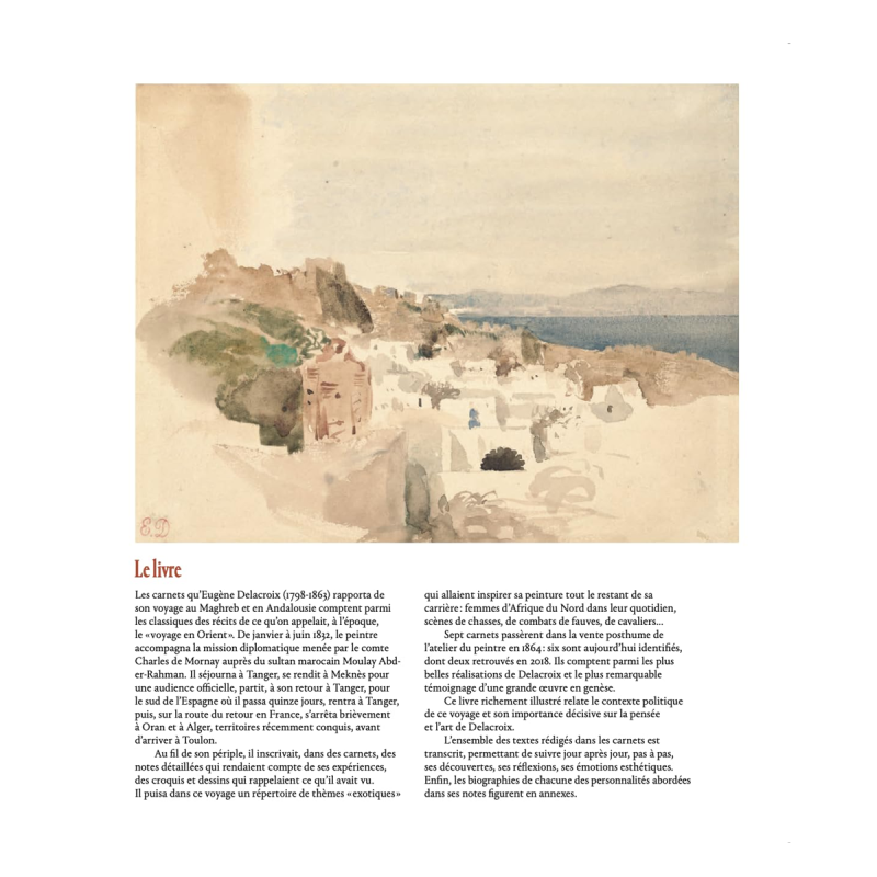 Delacroix. Carnets de voyage au Maghreb et en Andalousie es un testimonio fascinante del viaje que Eugène Delacroix realizó entre enero y junio de 1832 por el norte de África y el sur de España con la misión diplomática del conde Charles de Mornay ante el sultán de Marruecos. Este volumen presenta las reproducciones completas de los seis cuadernos de apuntes que el maestro del Romanticismo francés llenó con notas, dibujos y reflexiones sobre paisajes, escenas y personas que encontró en su camino, desde Tanger hasta Andalucía. Al recorrer estas páginas, que mezclan escritura y dibujo con una sensibilidad artística singular, el lector se acerca a la génesis de muchas de las obras más emblemáticas de Delacroix y a la mirada curiosa y observadora de un creador que transformó sus experiencias de viaje en pintura. Un ejemplar exquisito que conecta el espíritu aventurero del artista con su legado pictórico, ideal para conocedores del arte y amantes de la historia visual.