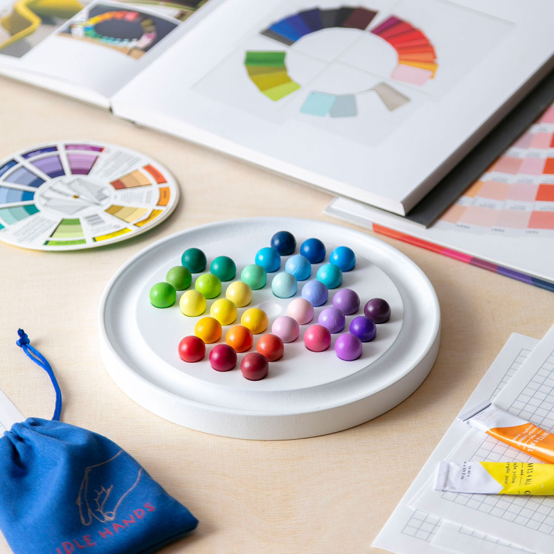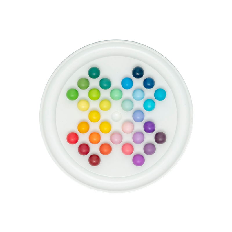 Las piezas, dispuestas en una armonía tonal que recorre el espectro del color, invitan tanto al juego estratégico como a la contemplación visual. La base, sólida y refinada, aporta equilibrio y sobriedad, mientras que la intensidad cromática introduce dinamismo y carácter.