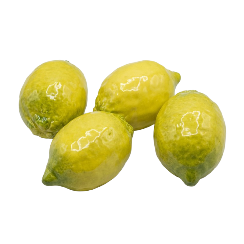 Limón decorativo realizado en cerámica moldeada y pintada a mano, con maduración del esmaltado por cocción a 980 grados. El proceso de producción artesanal proporciona a cada pieza un carácter único.